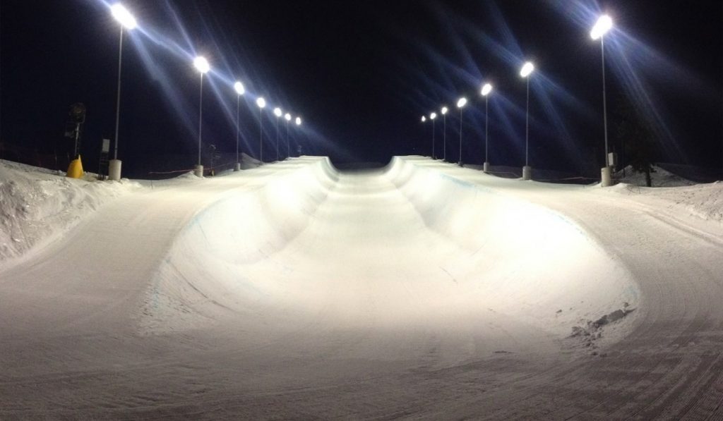 Under Armourās Locker Room is made up of two components that sit above and below the super pipe. The first piece is an Under Armour branded pillar that sits at the top of the pipe on the roll in. This monolithic pillar boasts grab bars on either side so the athletes can stand with ease while they wait to launch themselves into their run using the grab bars as leverage for the push off. It also acts as a wind block against the harrying wind in Calgary that so often blows from the west, easing wait times and communications for those at the top.
